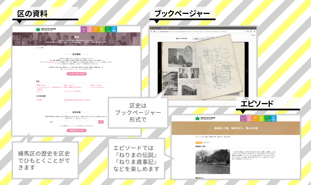 さて、デジタルアーカイブと言えば調査や研究が目的と思われがちですが、工夫次第で楽しいコンテンツとなり得ます。その恒例が、従来の目的だけに縛られず、親しみやすいデザインと「今日はなんの日?」で興味を惹くことに成功している『練馬わがまち資料館』。見せ方で盛り上げるほか、オープンデータの利用促進に関する仕掛けまで施されており、まさに充実したコンテンツとなりました。こうした提案性は、サイト閲覧者の間口を広げるだけでなく、サイトの滞留時間の長期化にも役立つなど、意外な付帯効果をもたらします。