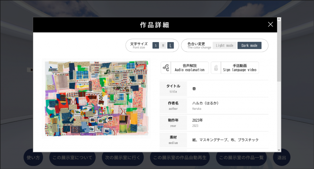 フロアに浮いて回転している四角錐をクリックすると、その位置に移動します。作品に向き合ってクリックすると、タイトルや作者、詳しい解説が表示されます。この解説は音声で聴くことができるほか、手話の動画も用意されています。一般的には後ろに表示されることが多い音声解説・手話動画のボタンが先頭に置かれていることから、障害のある方への配慮が重要視されていることがわかります。
